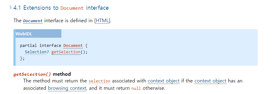 Window 객체의 getSelection 메소드의 경우, Window 객체 안의 document 속성에 기반하는 Selection 객체를 반환합니다.