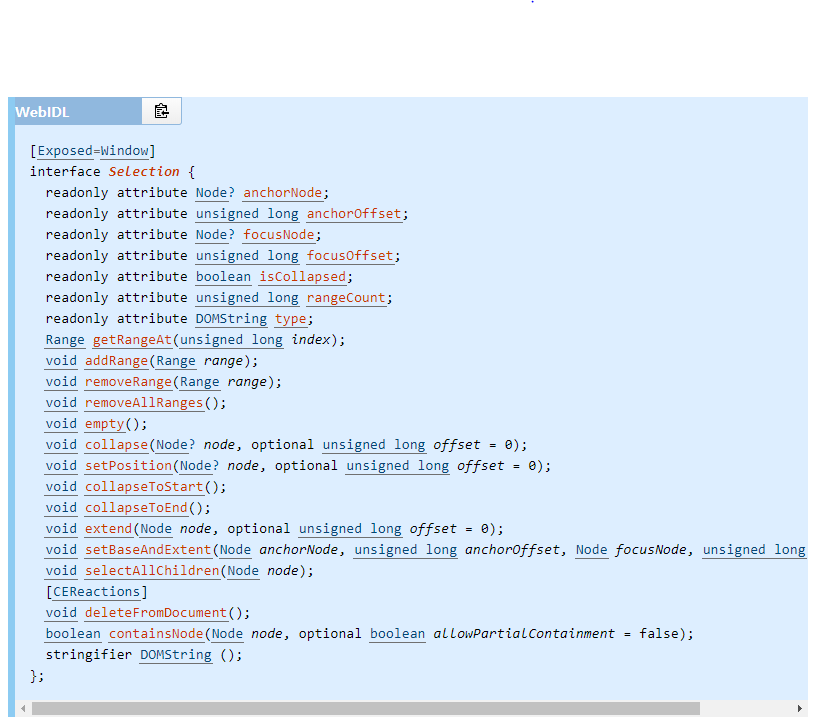 메소드명 파라미터 파라미터 설명 설명 getRangeAt index 꺼내올 Range 객체의 인덱스 번호입니다. 특정 index에 있는 Range 객체를 꺼내옵니다. addRange range 추가할 Range 객체 현재 Selection에 Range를 추가합니다. collapse node 접을 노드